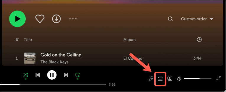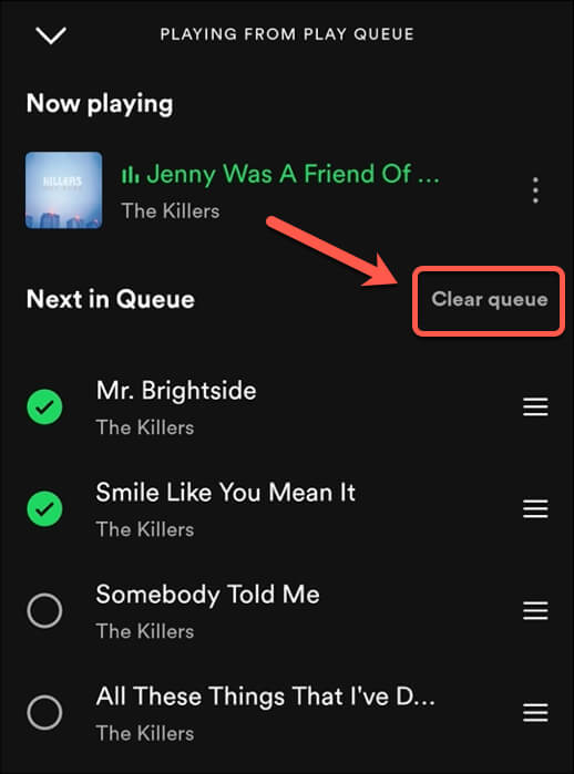 - Spotifyキューからすべてのアイテムをクリアするには、クリア 列ボタン。