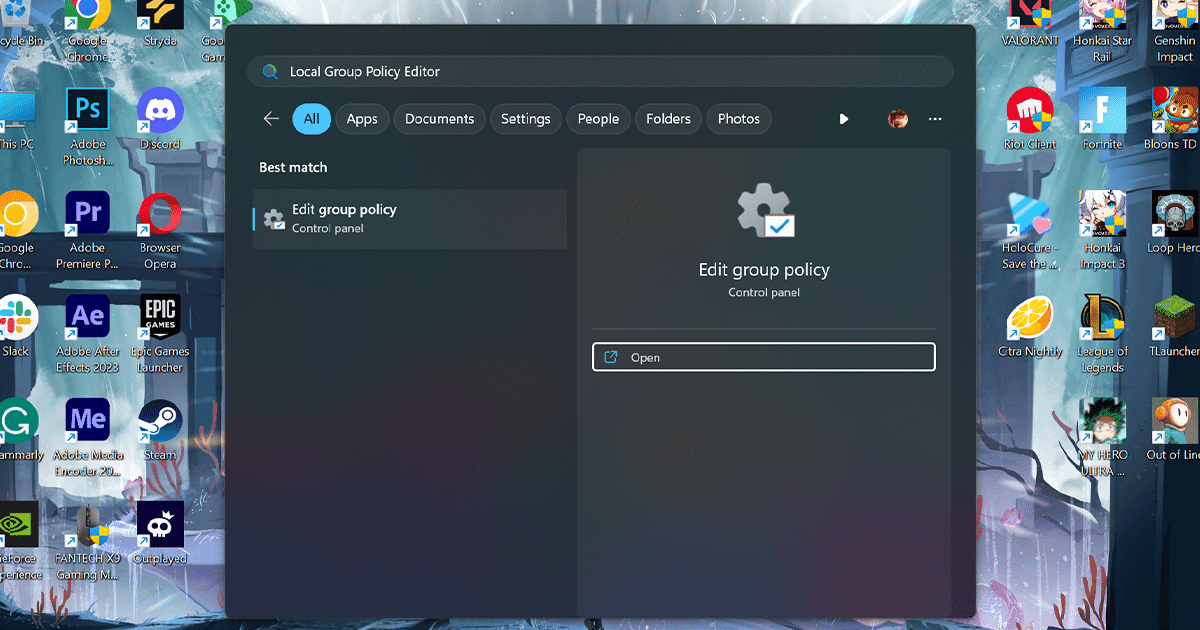 - 開始を開き、検索します地元のグループポリシーエディタークリックします開けるボタン。