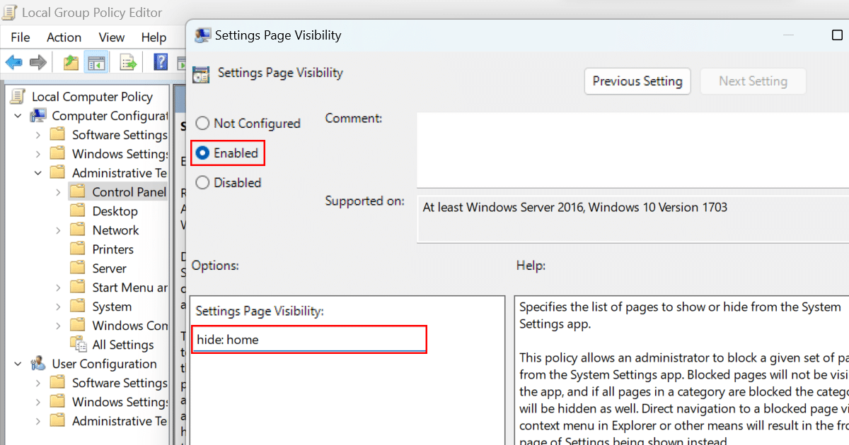 - を選択します有効になっていますオプションと変更設定ページの可視性」に値を設定します非表示:家。