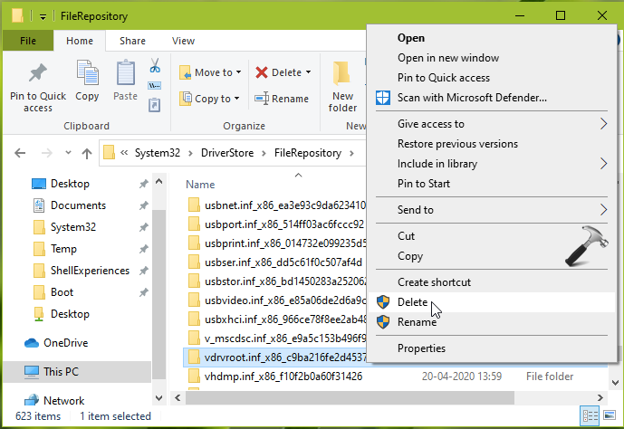 7。次に、ドライブ用の.infファイルを削除しました。そのため、ステップ2でINF名を取得したので、それをintialsとして使用して、これを助けて、ドライバーINFフォルダーをで見つけますC:WindowsSystem32DriverStoreFileRepository。フォルダーを右クリックして削除し、UAC許可を提供して終了します。