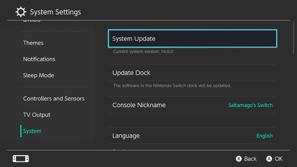スイッチファームウェアを更新するには、2つの方法があります。最も簡単なのは、インターネットでそれを行うことです。スイッチがインターネットに接続された状態で、ホームメニュー、行きますシステム設定(ギアアイコン)>システム>システムの更新。