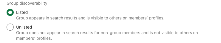 グループの発見可能性(必須):選択できますリストされていますまたはリストされていないこのオプションの場合。リストされていることは、グループが検索結果とそのメンバーのプロファイルに表示されることを意味します。非公開は反対であり、グループは検索に表示されず、メンバープロファイルには表示されません。