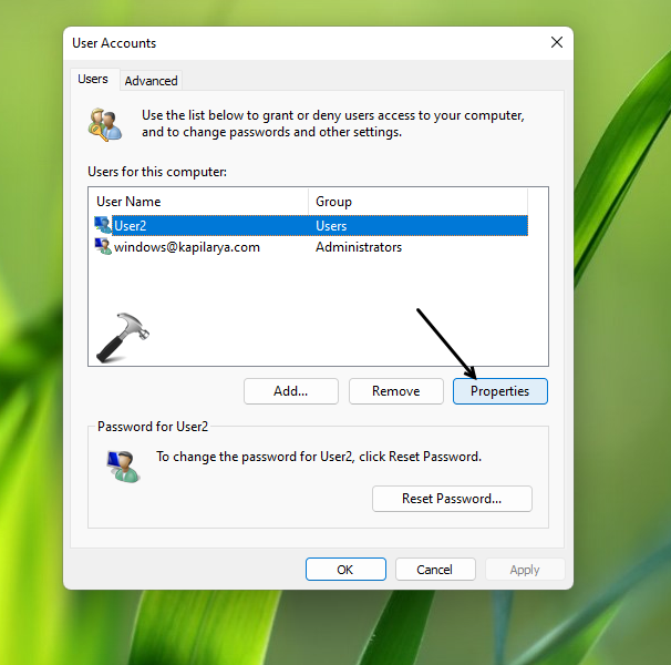 7。ここで、[ユーザーアカウント]ウィンドウに戻り、新しく作成したローカルアカウントを選択してクリックしますプロパティ。