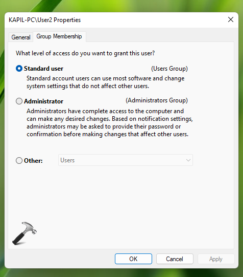 8。プロパティシートで、[グループメンバーシップ]タブに移動します。ここでは、そのローカルアカウントタイプを変更できます。必要に応じて、管理者にすることができます。 [OK]をクリックします。