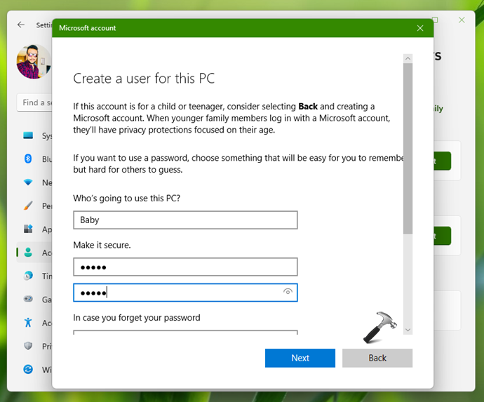5。このPCのユーザーの作成の下で、ローカルユーザーアカウント名を入力してパスワードを入力します。