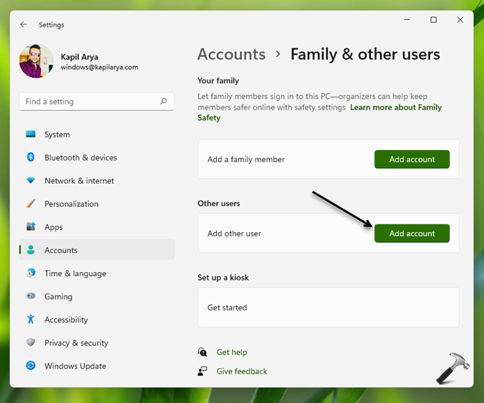 2。行きますアカウント>家族およびその他のユーザー。他のユーザーの下で、クリックしますアカウントを追加します。