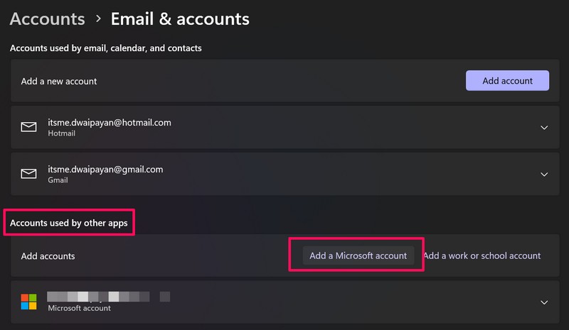 3。次のページで、をクリックしますMicrosoftアカウントを追加します下のADDアカウントオプションの横にボタンアカウント 他のアプリで使用されますセクション。