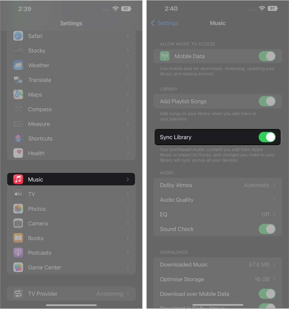 iPhoneで:設定➝音楽➝同期ライブラリ。