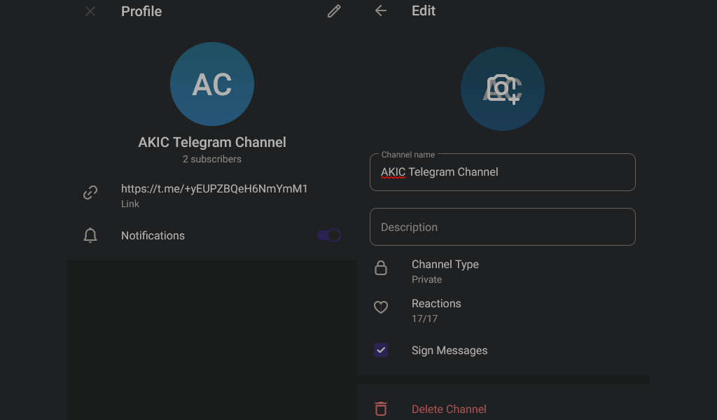 デフォルトでは、Webアプリを使用して作成されたすべての電報チャネルはプライベートです。これは、Telegramユーザーと招待リンクを共有して、チャンネルに持ち込む必要があることを意味します。人がこの招待リンクを持っていない場合、彼らはあなたのチャンネルに参加することができません。 Telegramのモバイルおよびデスクトップアプリでは、セットアッププロセス中に作成するチャネルのタイプを選択できます。