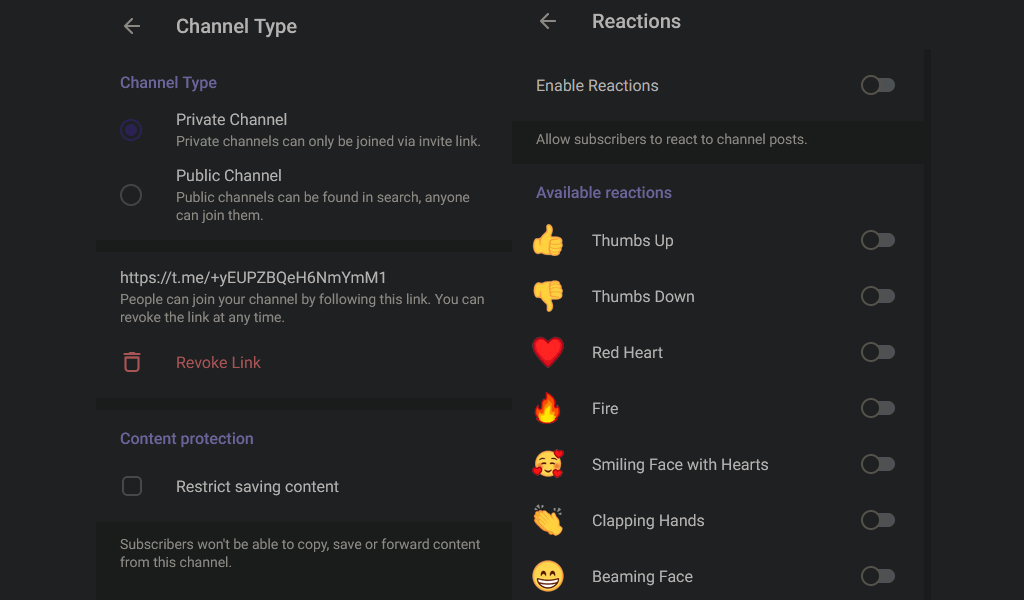前のページに戻り、選択しますチャネルタイプ。下コンテンツ保護、クリックできます保存コンテンツを制限します人々がTelegramチャンネルで共有したメッセージやメディアのコピー、転送、保存を妨げるため。ただし、これにより、人々がスクリーンショットを撮ったり、共有しているものを録音するのを止めることはないので、これらの許可をバイパスする方法に注意してください。