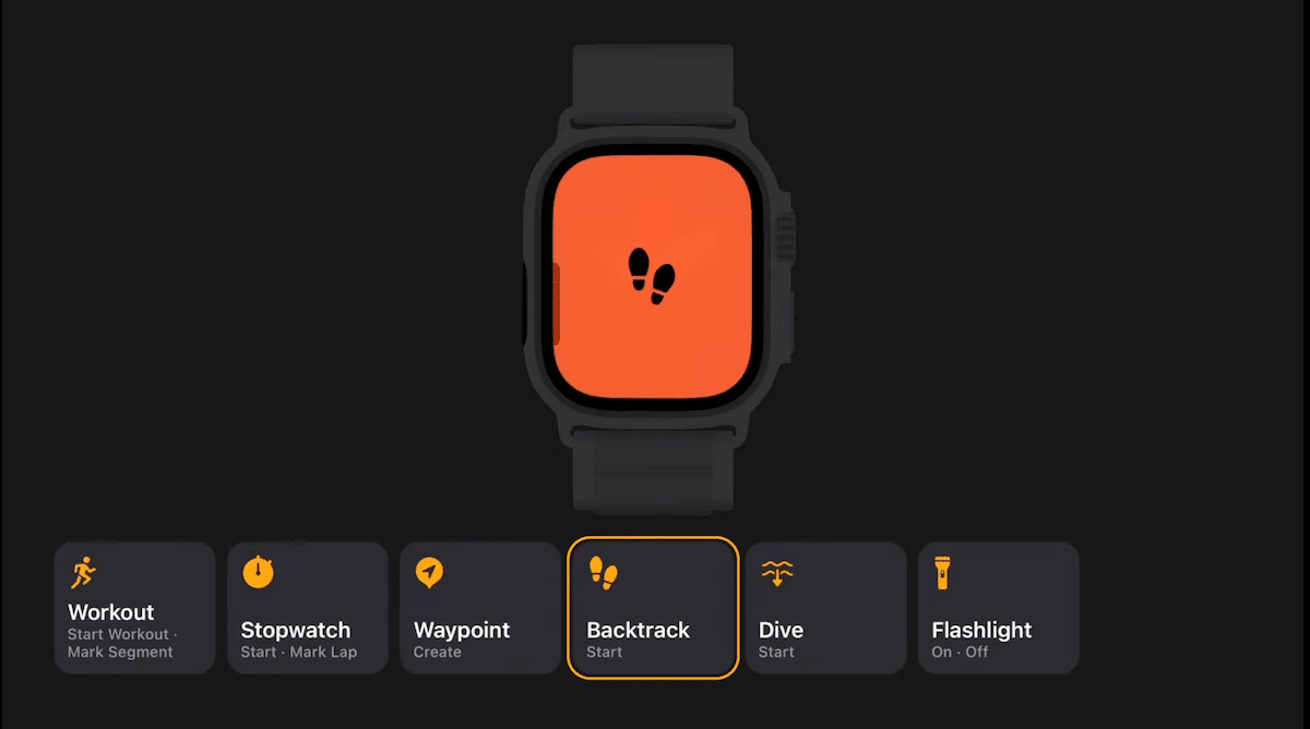 ユーザーがトレーニングやダイビングセッションをすばやく開始するだけでなく、アプリを切り替えることも役立ちます。たとえば、アクティブなハイキングワークアウト中に、ユーザーはトラックを忘れます。その場合、Apple Watch Ultraのアクションボタンをタップするだけで、コンパスのバックトラックをすばやく開き、ハイキングを撤回します。