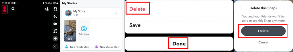 - ストーリーに複数のスナップを追加した場合は、タップして削除するものに進みます。