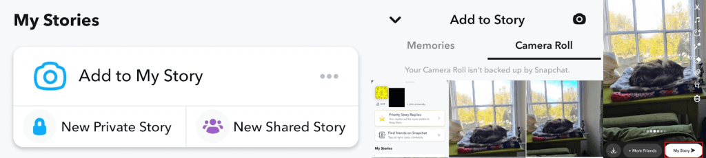 - プロフィールに移動してタップします私の話に加えてくださいまたは選択します新しいプライベートストーリーまたは新しい共有ストーリーストーリーにスナップを追加するため。次に、カメラロールまたはメモリから追加するスナップを選択してタップします私の話それらを追加します。
