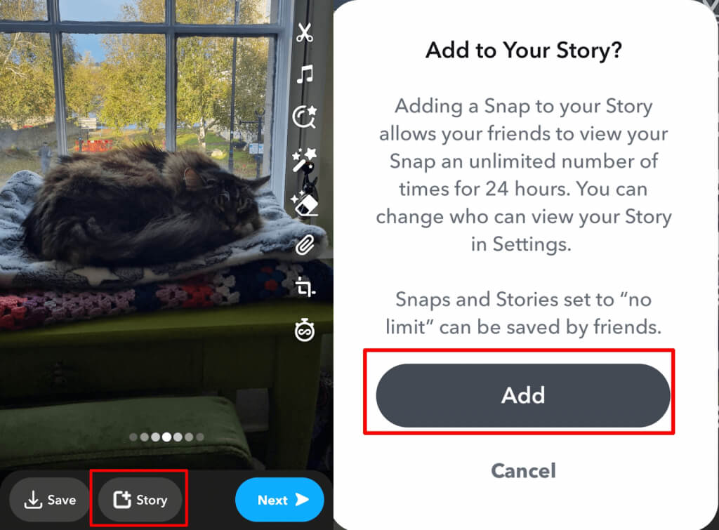 - または、あなたがあなたとスナップを作成した後Snapchatカメラ、タップしますストーリーアイコン画面の下部で、タップします追加ストーリーにスナップを追加したいことを確認してください。