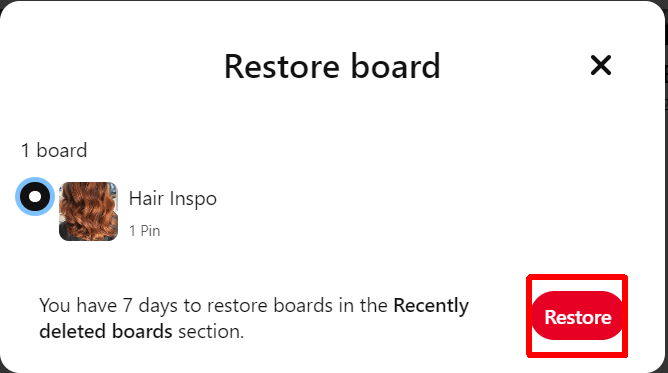 - 復元するボードを見つけて、クリックして、クリックします復元する。