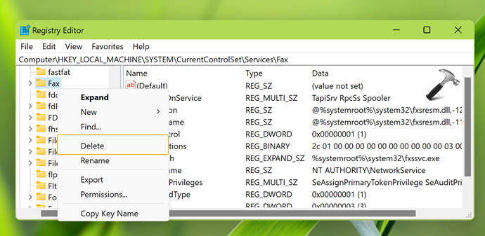 3。サービスの下で、削除するサービスのレジストリサブキーを見つけます。このサブキーは、サービス名と同じ名前を付けてください。削除することを選択したサービスのレジストリキーを見つけたら、それを右クリックして選択します消去。クリックはい確認プロンプトで。