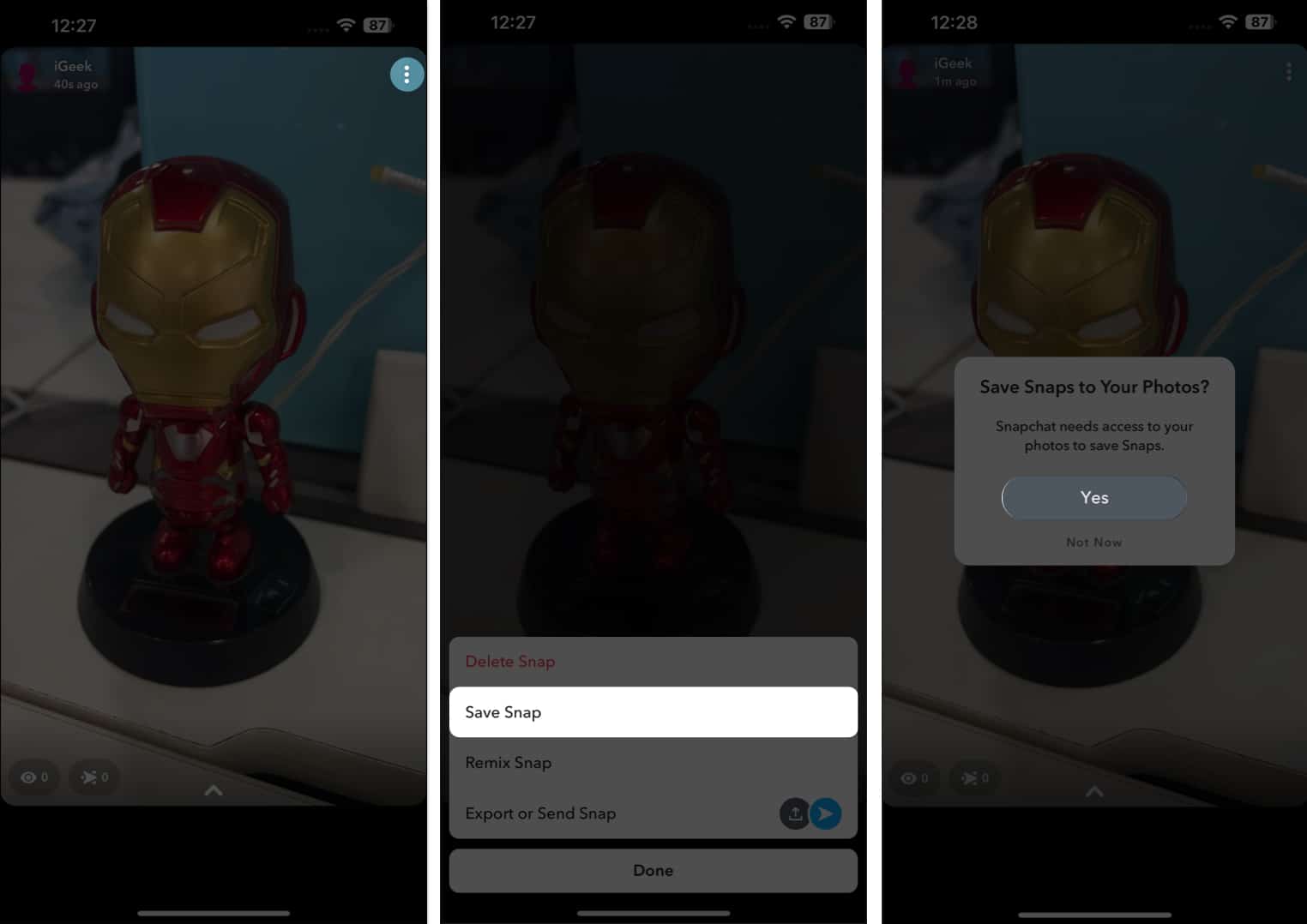 注記:安全な側にいることは、それを削除する前にsnapchatストーリーを保存することは賢明です。タップするだけです3ドットアイコン→スナップを保存します→ヒットはい。そうすることで、それぞれのストーリーが写真アプリに表示されます。