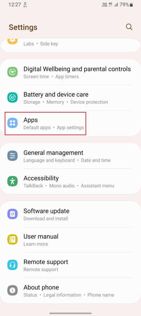 1。開きます設定Samsung電話のアプリとタップをタップしますアプリ。