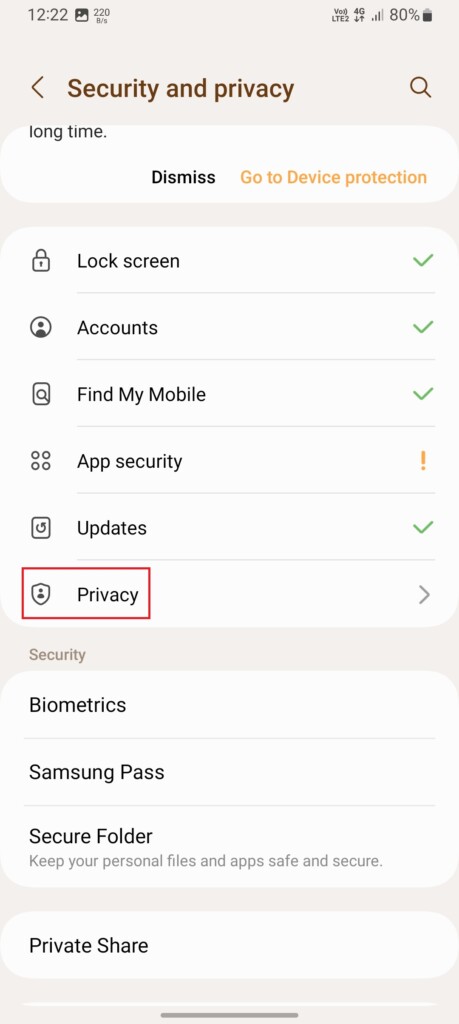 1。開きます設定携帯電話のアプリをタップしますセキュリティとプライバシー。