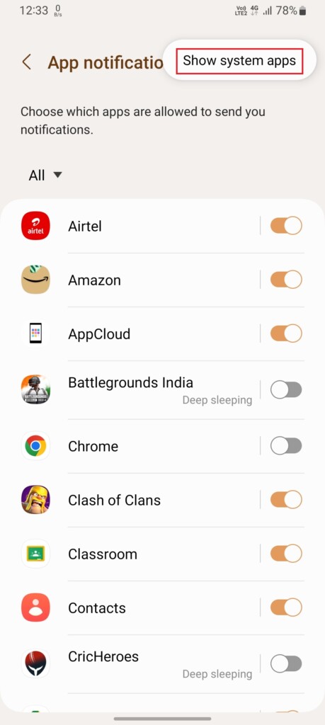 3。最初に右上の3つのドットをタップしてから、システムアプリを表示しますオプション。