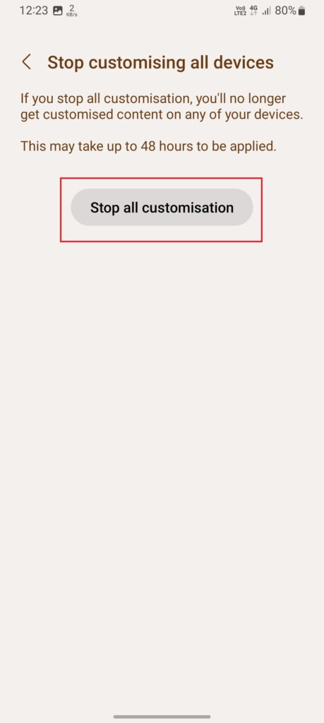 6。ここで、すべてのSamsungデバイスでカスタマイズされた広告を無効にしたい場合は、タップするすべてのデバイスのカスタマイズを停止します、そして押しますすべてのカスタマイズを停止しますボタン。