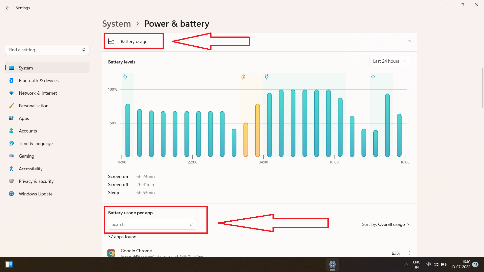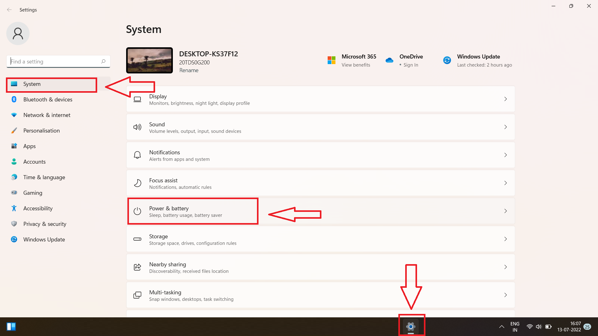2。起動しますシステム左メニューバーからオプションをクリックしてからクリックしますパワーとバッテリー正しいセクションから。