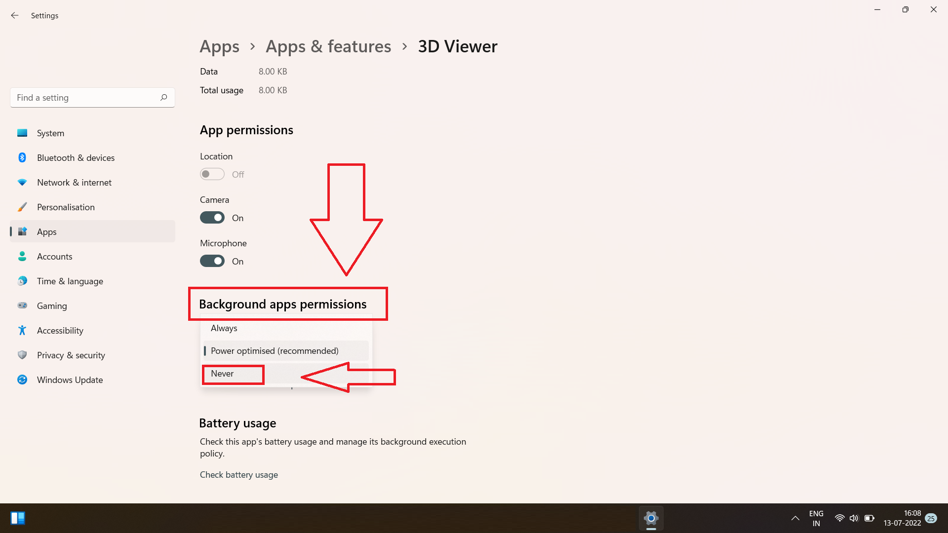 6。の下バックグラウンドアプリの許可、クリックしてください一度もないバックグラウンドで実行されないようにします。