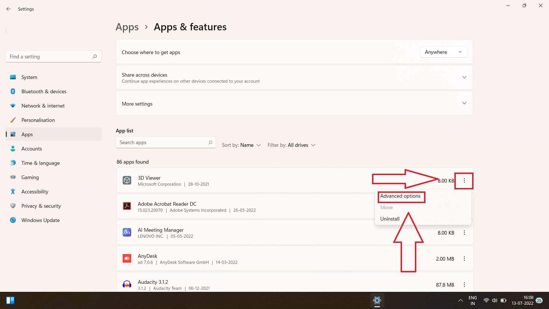 3。をクリックします3ドット左上からメニューボタンをクリックしてからクリックしますアドバンス設定アプリケーションの場合、バックグラウンドの実行を停止します。