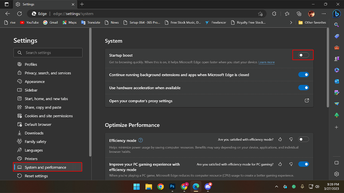 - クリックしてくださいシステムとパフォーマンス>切り替えますスタートアップブーストオプション。
