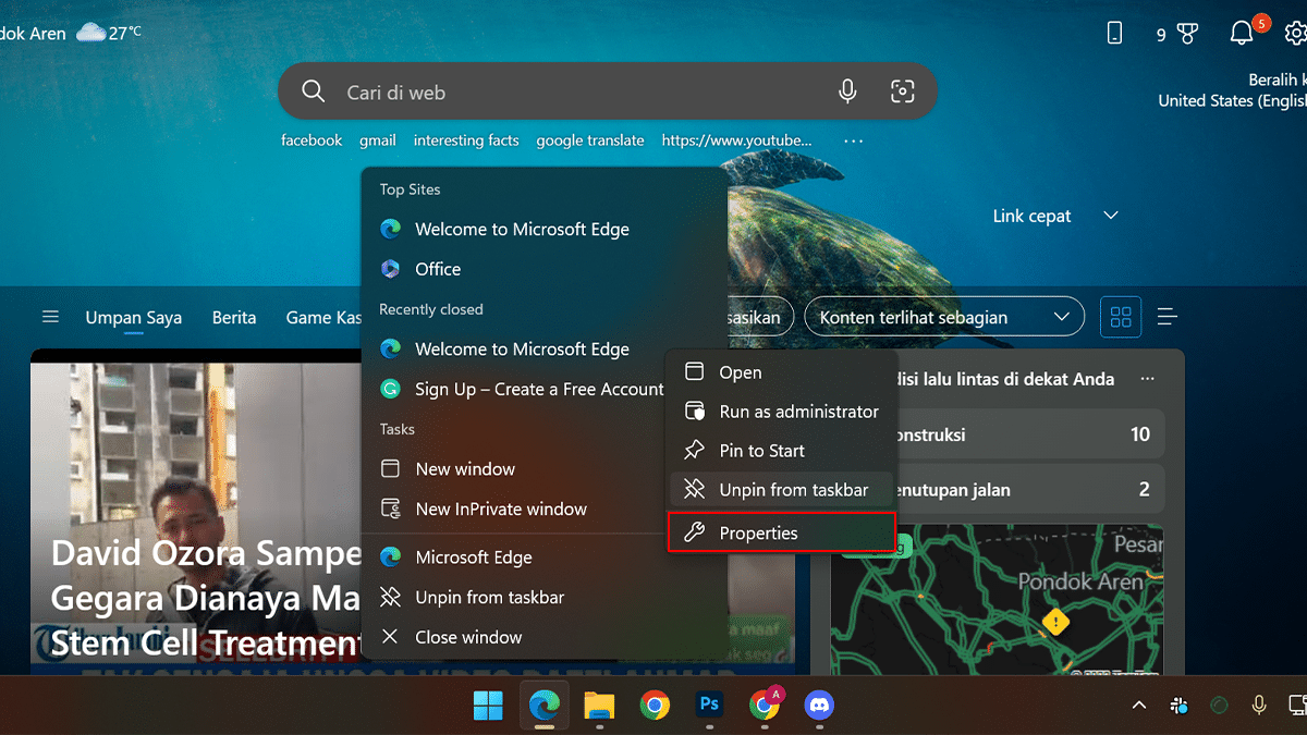 - [アプリ]ボタンを右クリックして、右クリックしますMicrosoft Edge、およびを選択しますプロパティオプション。