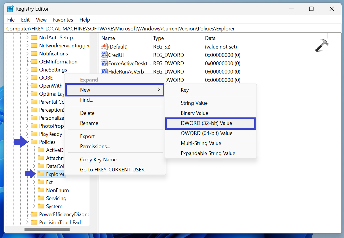 ポリシーを右クリックして、new =>キーを選択します。 「エクスプローラー」と入力し、[OK]をクリックします。