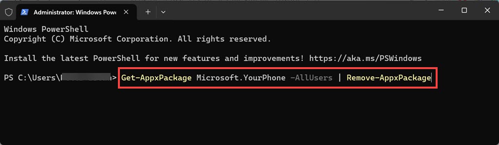 2。PowerShellウィンドウで、次のコマンドを入力して、電話リンクアプリをアンインストールします。Get-AppxPackage Microsoft.YourPhone -AllUsers | Remove-AppxPackage