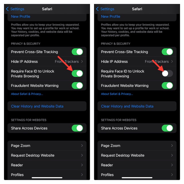 - 最後に、次のトグルをオフにしますプライベートブラウジングのロックを解除するには、フェイスID/タッチIDが必要ですそして、設定アプリから出ます。