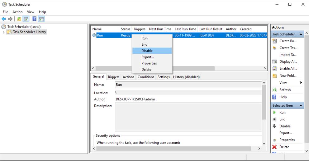 最良のアプローチは、タスクスケジューラを使用してタスクを無効にすることです。これは、タスクに関する追加の詳細を提供するためです。プロパティメニューを使用して、タスクの説明、トリガー、または履歴を調べることができます。