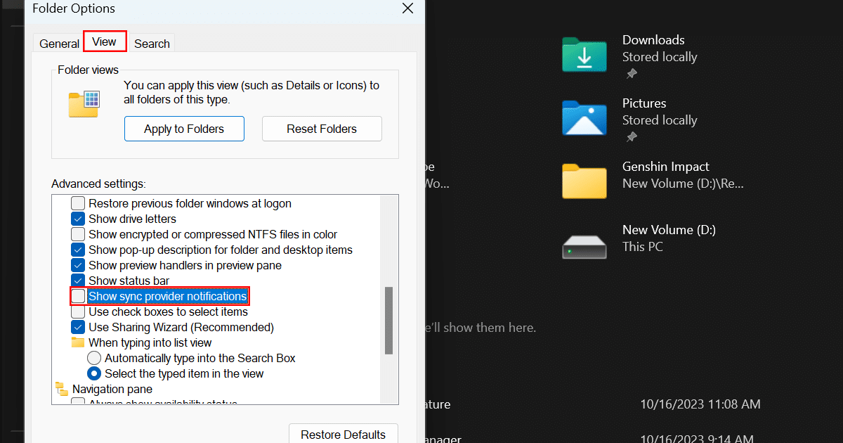 - クリックしますビューのタブフォルダーオプションウィンドウと「」の横にあるチェックボックスをクリアします同期プロバイダーの通知を表示します。」