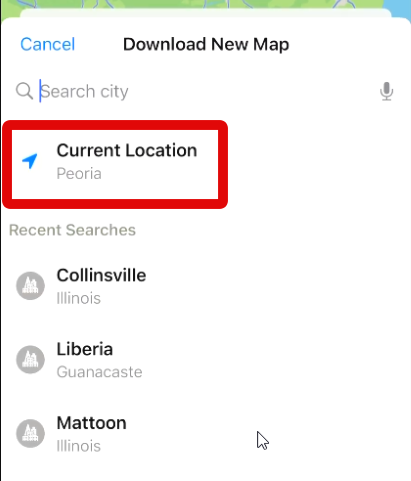 10。タップするとき新しいマップをダウンロードします、あなたの場所を選択するように求められます。すでに検索して選択したため、オフラインでダウンロードしたい場所、タップ、選択現在の場所。