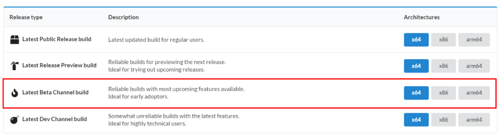 3。クリックしてくださいシステムのアーキテクチャの横に与えられます最新のベータチャネルビルド。
