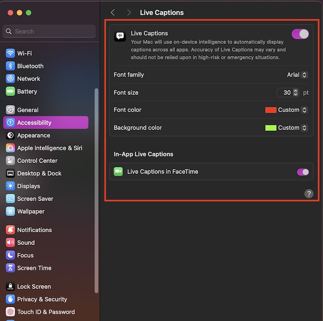 Modern MacOSバージョンには、「ライブキャプション」と呼ばれる非常に便利なアクセシビリティ機能が付属しています。オンデバイスインテリジェンスの力を活用すると、サポートされているアプリにキャプションが自動的に表示されます。