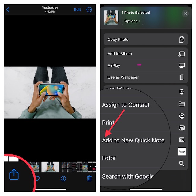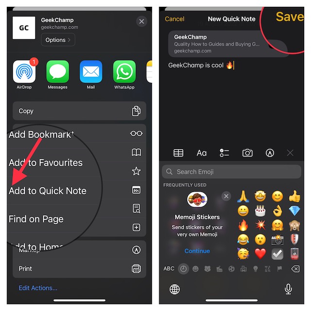 2。をタップしますアイコンを共有しますを選択します新しいクイックノートに追加します共有シートのオプション。