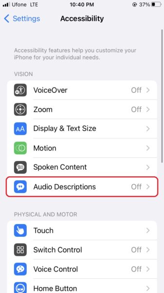 - 次に、タップしますオーディオの説明ビジョンセクションの下。