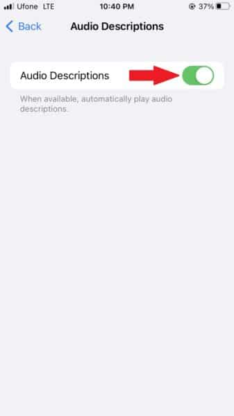 - 次のトグルをタップしますオーディオの説明機能を有効にするため。
