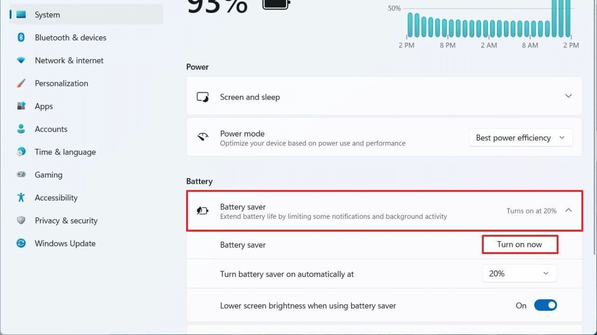 - の下バッテリーセクション>クリックしますバッテリーセーバー設定>クリックします今すぐ電源を入れてくださいのボタンバッテリーセーバー設定。
