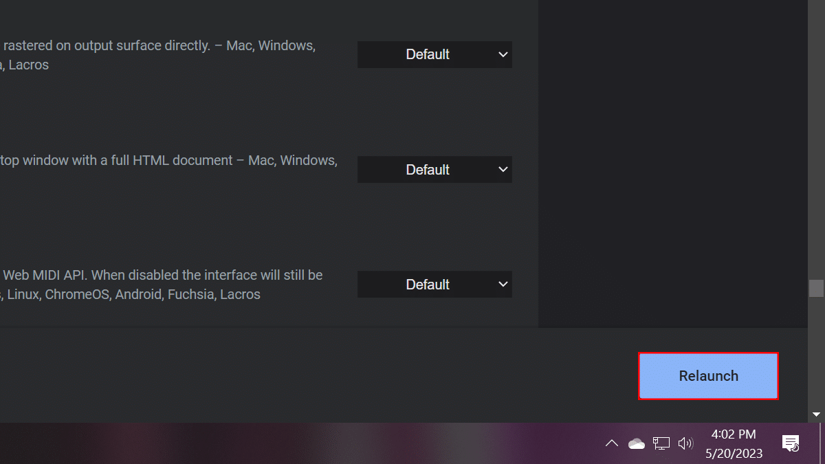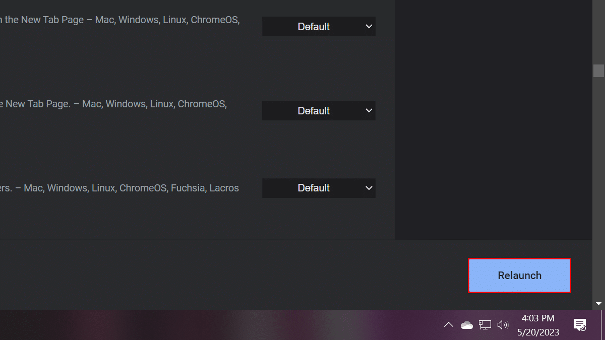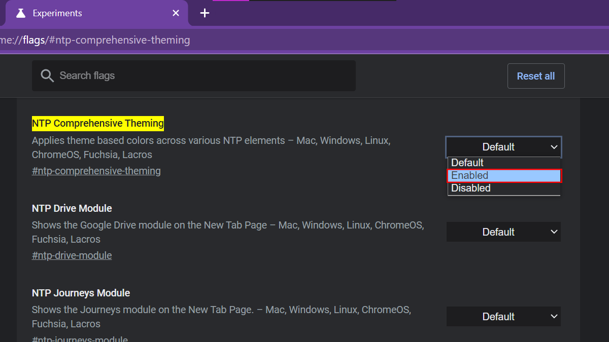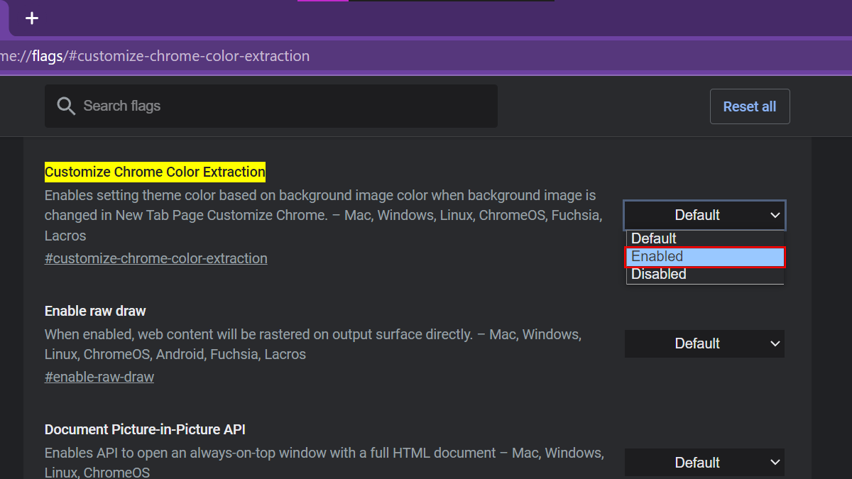- を使用します「Chromeカラー抽出をカスタマイズ」右側のドロップダウンメニュー> []を選択します有効になっていますオプション。