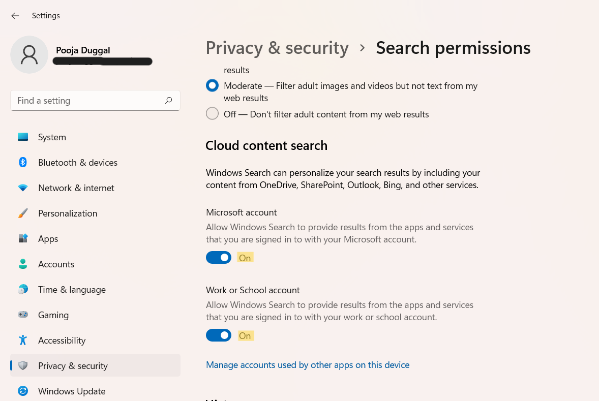 2。クラウドコンテンツ検索で、スイッチを切り替えますの上のためにMicrosoftアカウントそして仕事または学校のアカウント好きなように。これにより、クラウドコンテンツ検索が可能になります。