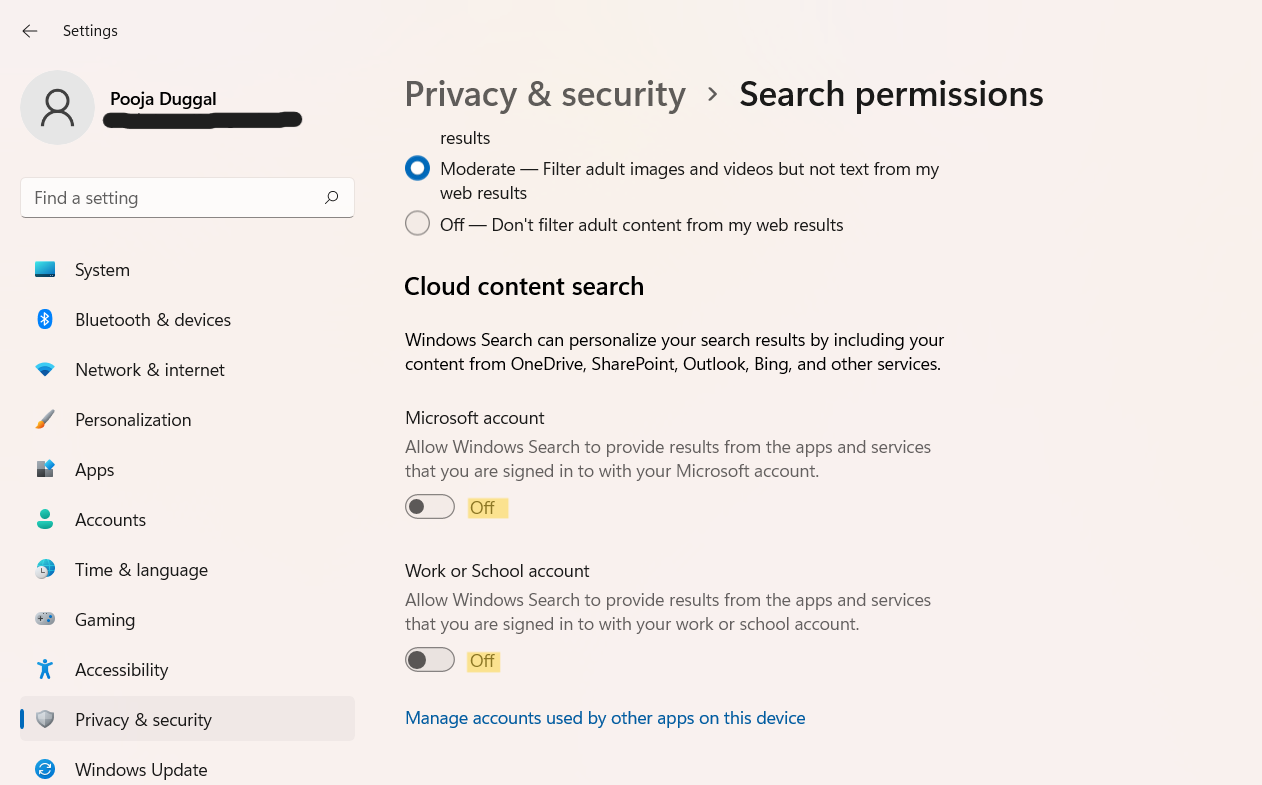 3。クラウドコンテンツ検索を無効にするには、スイッチを切り替えますオフのためにMicrosoftアカウントそして仕事または学校のアカウント。