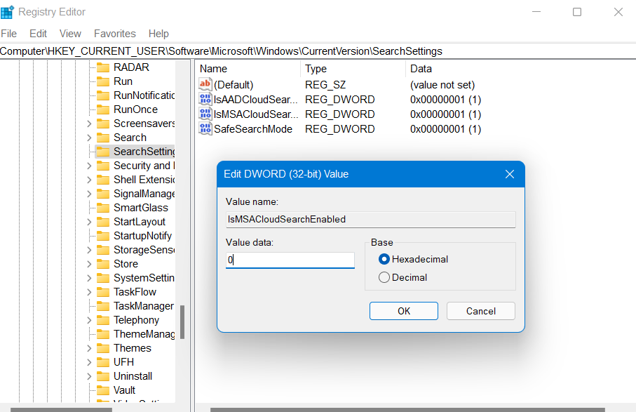 次に、ダブルクリックしますIsmsacloudsearchEnabledreg_dwordとその値を変更します1クラウドコンテンツ検索を有効にするため。