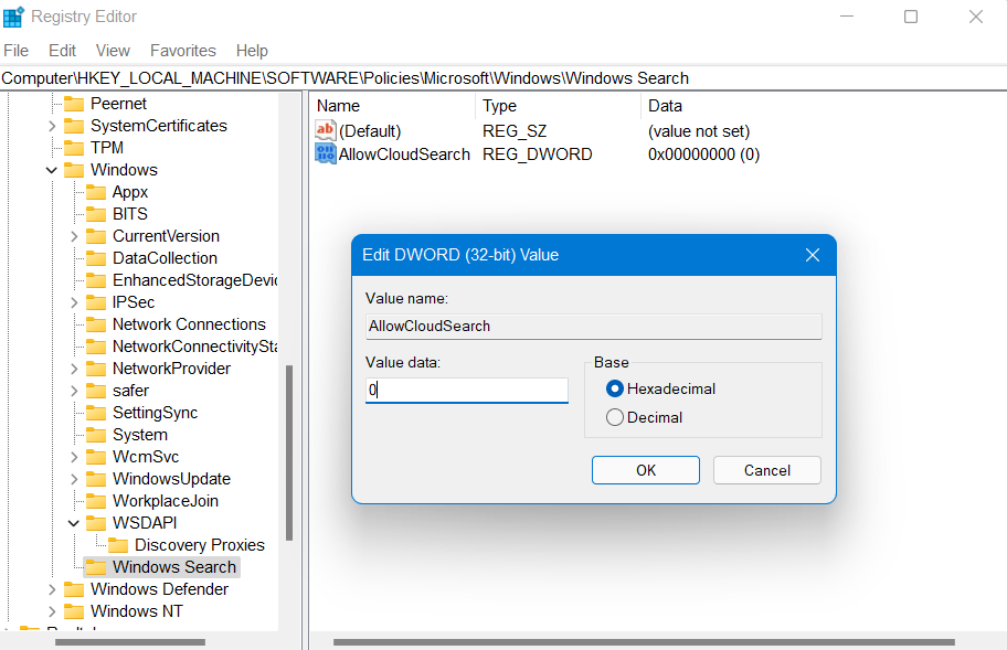 HKEY_LOCAL_MACHINESOFTWAREPoliciesMicrosoftWindowsWindows Search