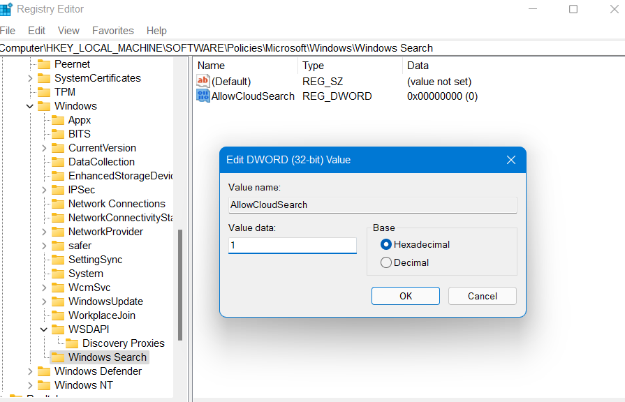 3。次に、ダブルクリックしますAllowcloudSearchreg_dwordとその値を変更します1クラウドコンテンツを有効にするには、すべてのユーザーを検索します。