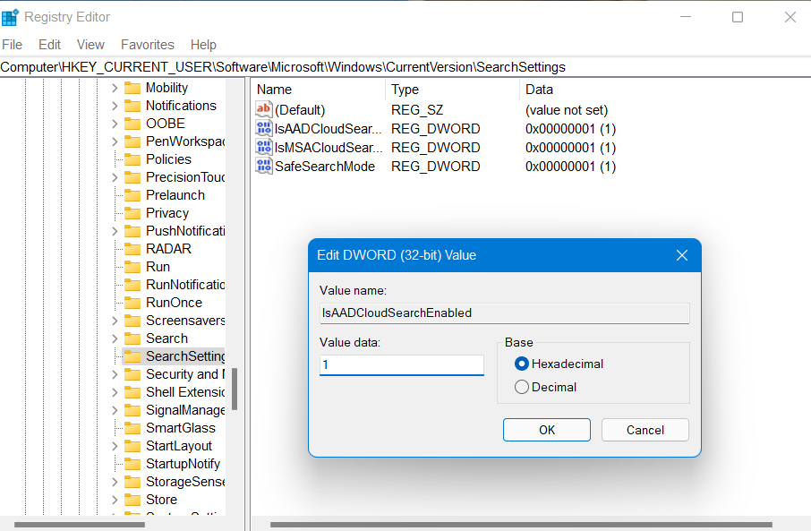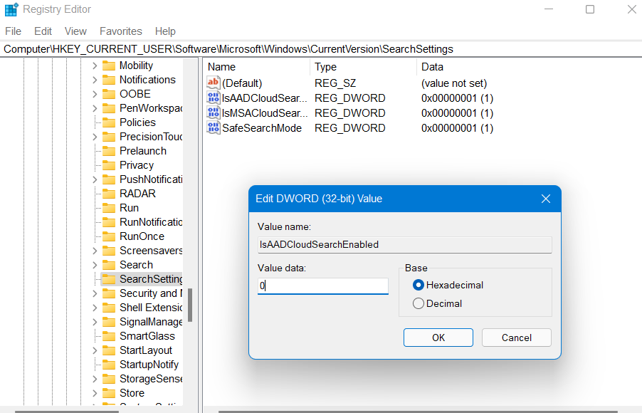 ダブルクリックしますisaadcloudSearchEnabledreg_dwordとその値を変更します1クラウドコンテンツ検索を有効にするため。