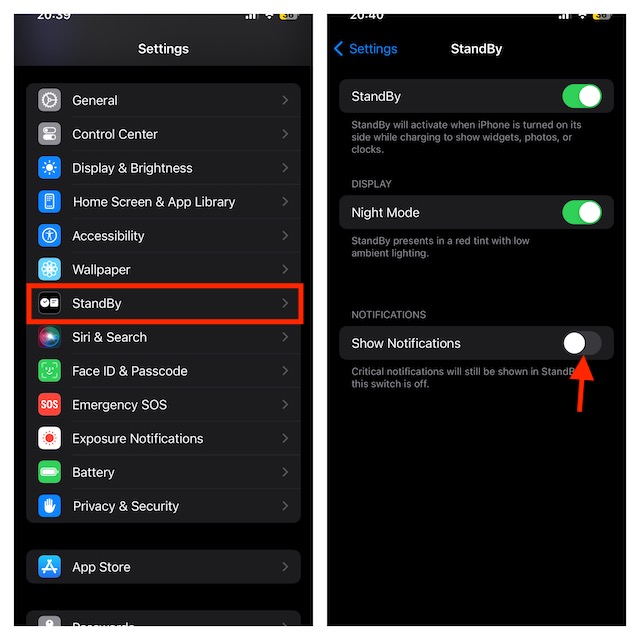 - iPhoneの「設定」アプリ - >「スタンバイ」に移動し、[通知]を表示するトグルを無効にします。
